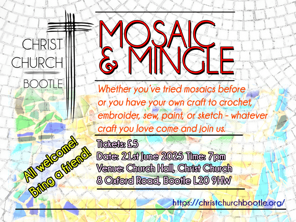 This Saturday is our monthly craft evening. This time, instead of crochet, we will be turning our hand to mosaics. Come along and make your own mosaic coaster. £5 per person to cover materials.
